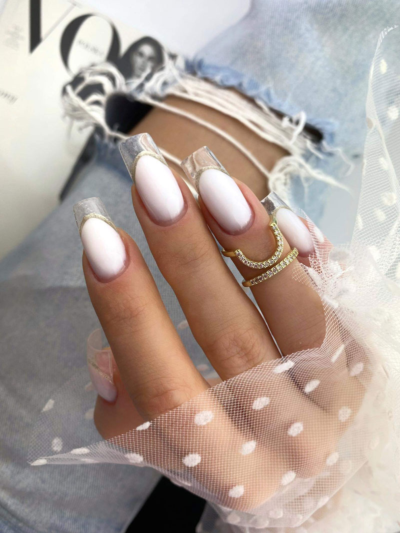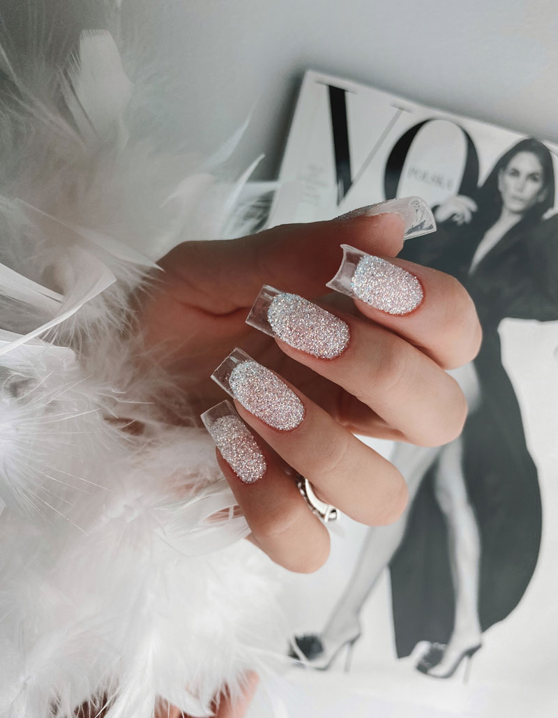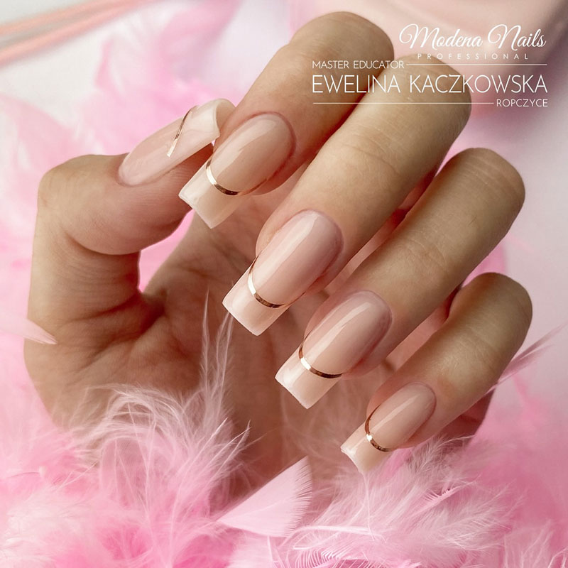 8. Aplikacja topu tworząc linie światła: technika aplikacji topu w celu uzyskania idealnej linii światła na paznokciach, co dodaje im blasku i wykończenia na zwieńczenie idealnej stylizacji.